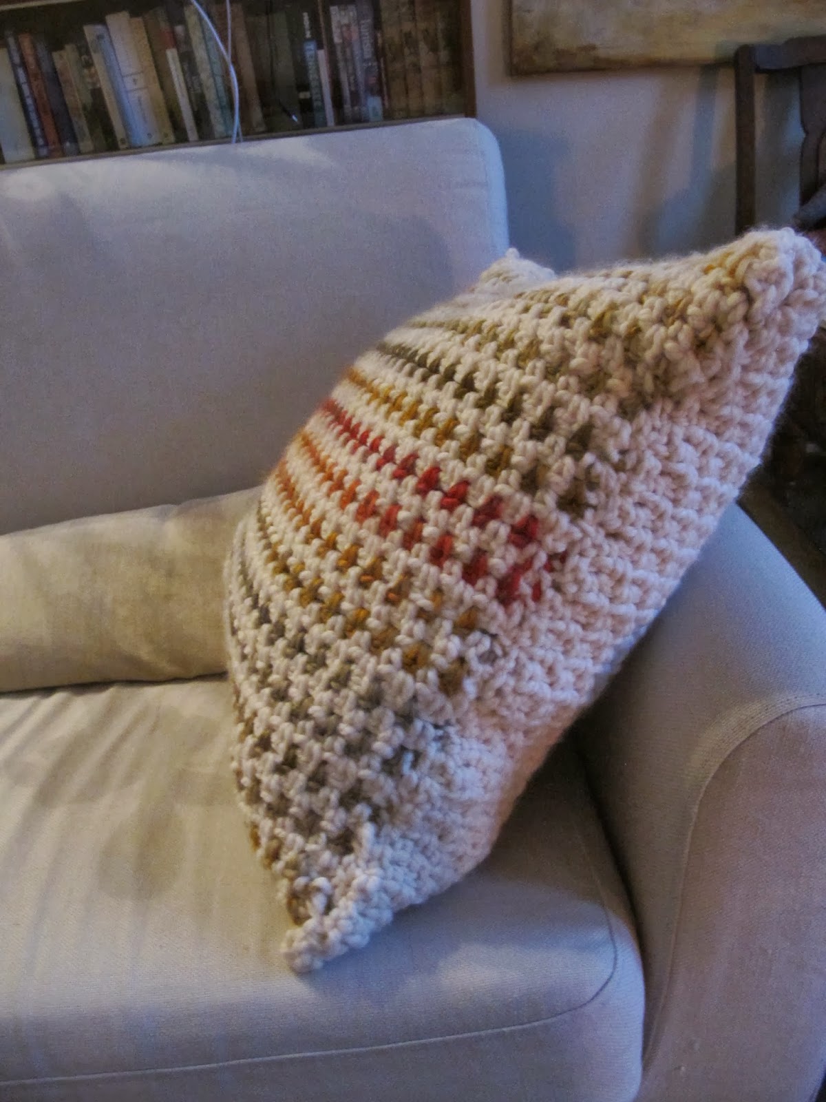 Moss Stitch with Chunky Off White Cozy Wool from +Michaels. Every 3rd row in a variegated Chunky yarn. Goose Down Insert (Thank you for existing +Tuesday Morning). Super comfy 70's looking pillow.